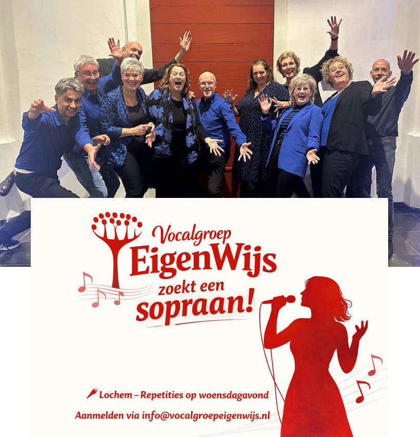 EigenWijs is een enthousiaste Vocal Group uit Lochem, bestaande uit 11 zangers en zangeressen. Elke week werken we met veel plezier aan onze gezamenlijke muzikale ambitie. We werken met onze enthousiaste dirigent Dennis Weelink aan klankkleur, samenzang, ritme en muziekbeleving.